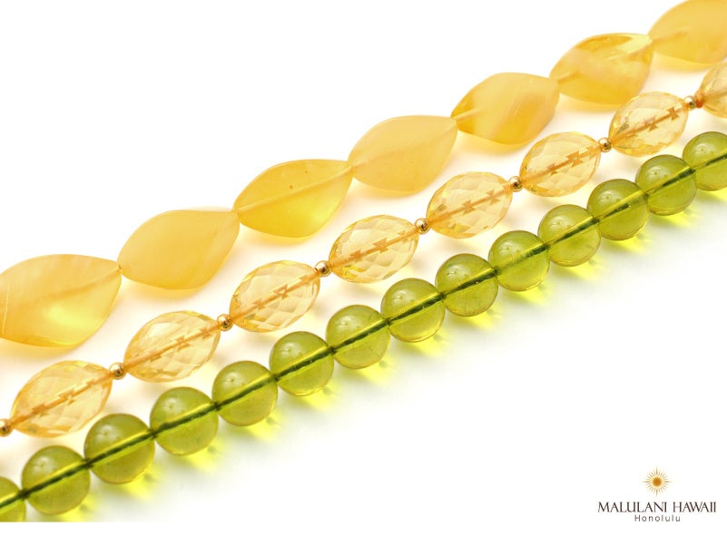 太陽神の象徴とされるシトリン、ペリドット、ブルートパーズに、大いなる愛を授けるモルガナイトをプラスし、明るく柔らかで温かみのある仕立てとなりました。