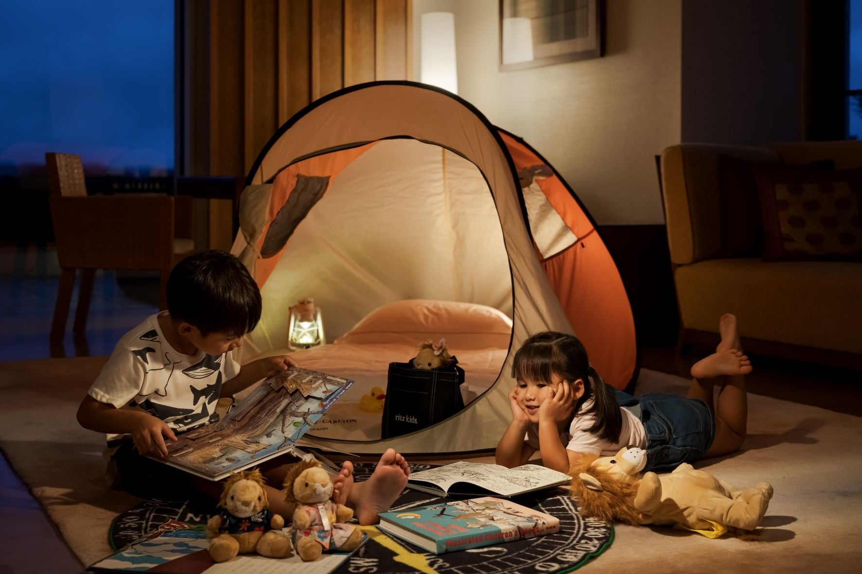 客室にキャンプテントをご用意し、ランタンやフロアマットでデコレーションして、ホテルに居ながらにしてキャンプ気分をご体験いただけます。ライオンリュックや、リオン君のぬいぐるみなどのスペシャルアメニティーはご自宅へお持ち帰り可能ですので、ご旅行後もご滞在のひとときに浸っていただくことができます。