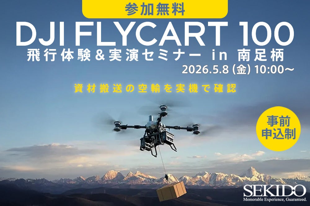 DJI(ディージェイアイ)正規販売代理店として物流ドローンの導入支援を行う株式会社セキド(本社: 東京都港区、代表取締役: 大下貴之)は、株式会社コヤワタオフィス(本社:神奈川県南足柄市、代表取締役:大田梢)と共催で、2026年5月8日(金)に神奈川県南足柄市で「DJI FLYCART 100 飛行体験&実演セミナー」を開催します。