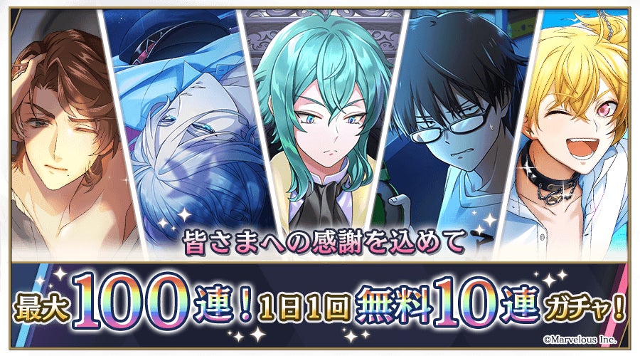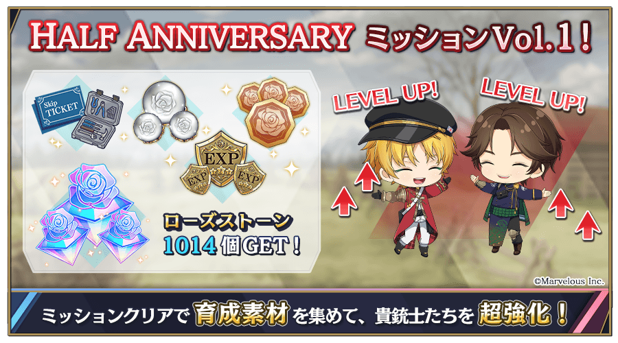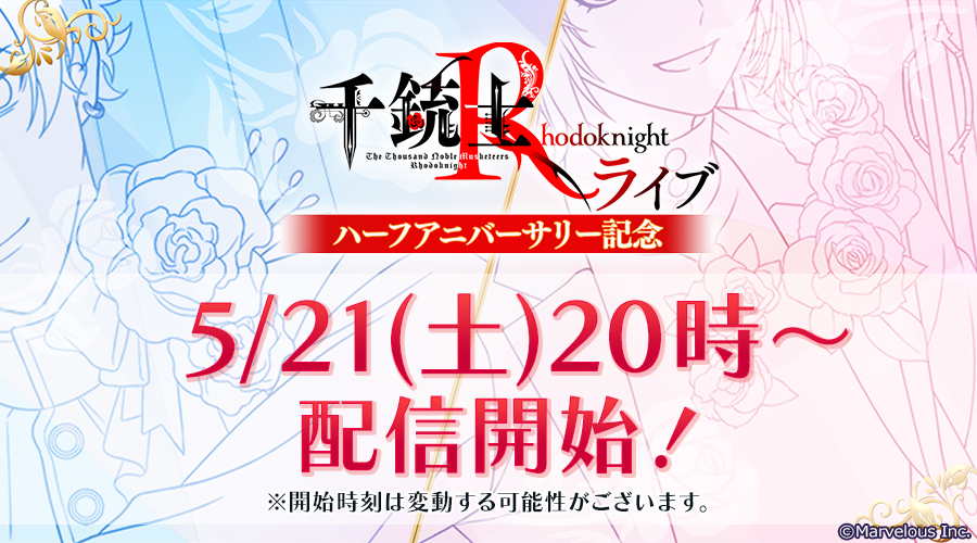株式会社マーベラス(代表取締役社長 許田周一/所在地:東京都品川区)による、『千銃士』プロジェクトの完全新作スマートフォンゲーム『千銃士:Rhodoknight』(読み:せんじゅうし ろーどないと 以降、『千銃士R』)は、5月24日に迎えるハーフアニバーサリーを記念して様々なイベントやキャンペーンを開催いたします。本日キャンペーン第2弾を開始しました。最大100連引ける毎日無料10連ガチャや、ハーフアニバーサリー衣装に身を包んだ「ライク・ツー」と「シャルルヴィル」が登場するハーフアニバーサリー記念ガチャ、ローズストーンが獲得できる限定ミッションなど開催中です。また、ハーフアニバーサリーを記念した生配信の決定を発表いたしました。