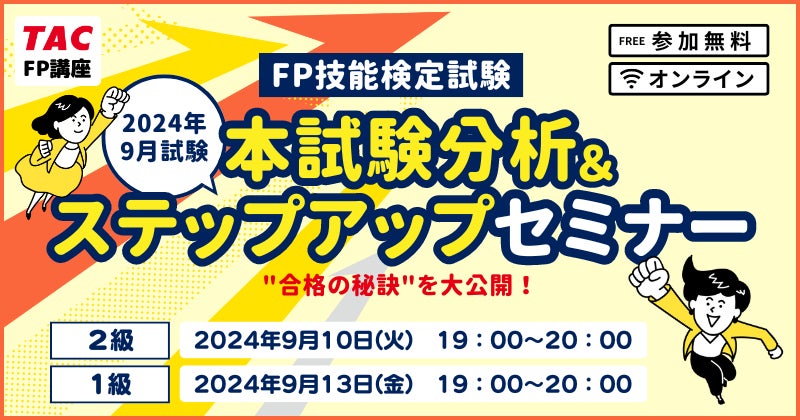 ファイナンシャル・プランナー(以下、FP)、簿記検定試験、税理士、公認会計士などの資格取得に向けた教育サービスを展開しているTAC株式会社(東京都千代田区、代表取締役:多田 敏男)は、9/8(日)に実施される『FP技能検定試験』の「本試験解説PDF(2級)」を無料でダウンロード、「本試験解説Web動画(1級)」を無料で視聴できる専用ページをご用意いたしました。