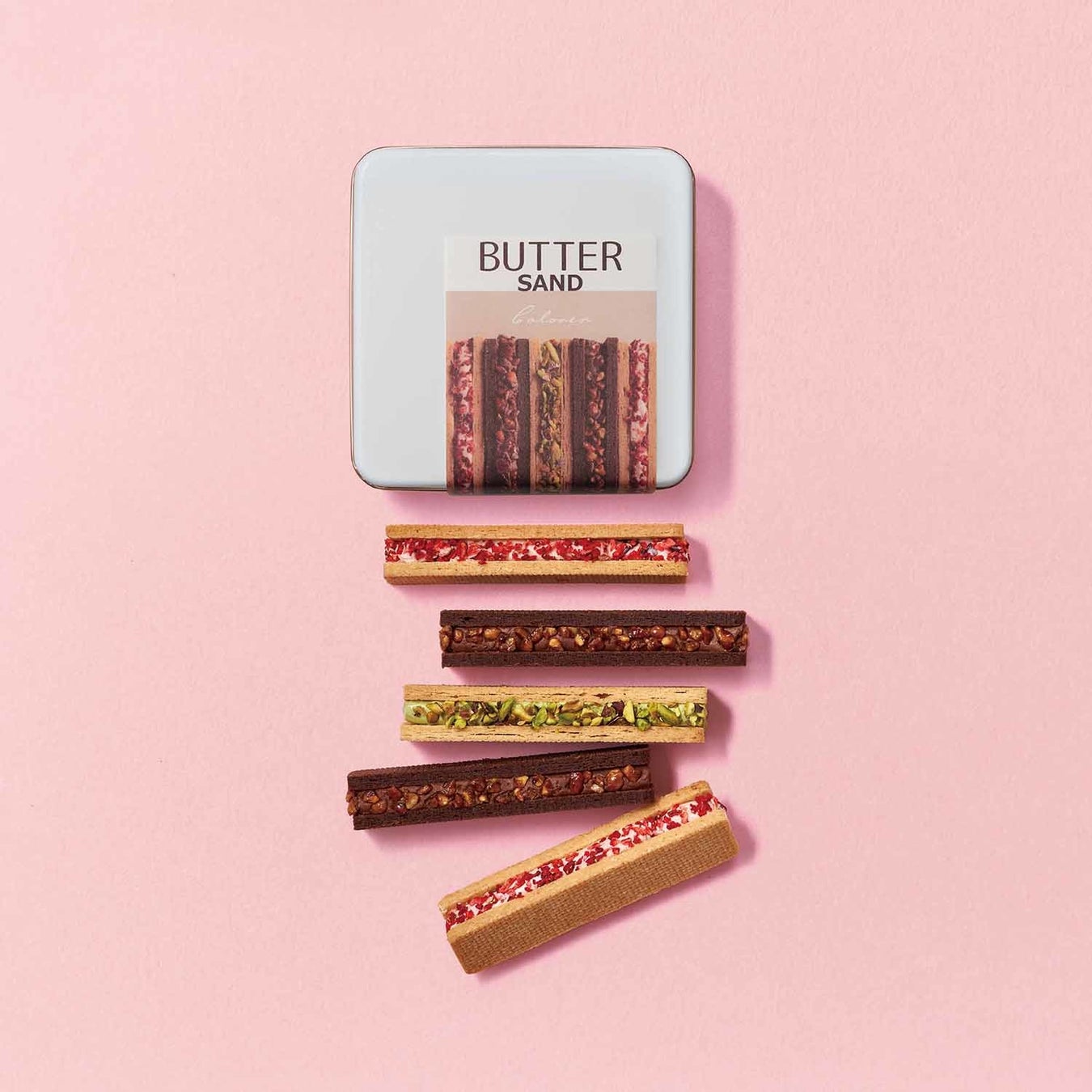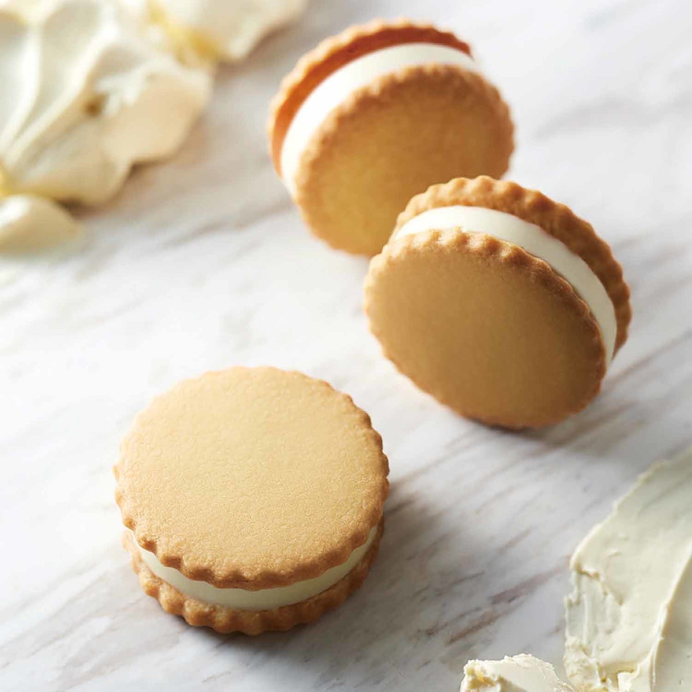 ピスタチオやショコラ、苺を包んだバタークリームをサブレでサンド。