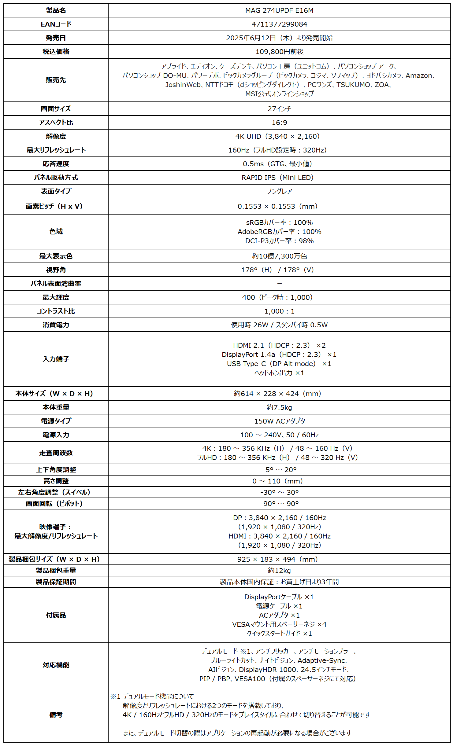 MSI初のMini LEDバックライト採用ハイスペックゲーミングモニター デュアルモード搭載で4K / 160Hz・フルHD / 320Hzを自由にチェンジ 「MAG 274UPDF E16M」発売