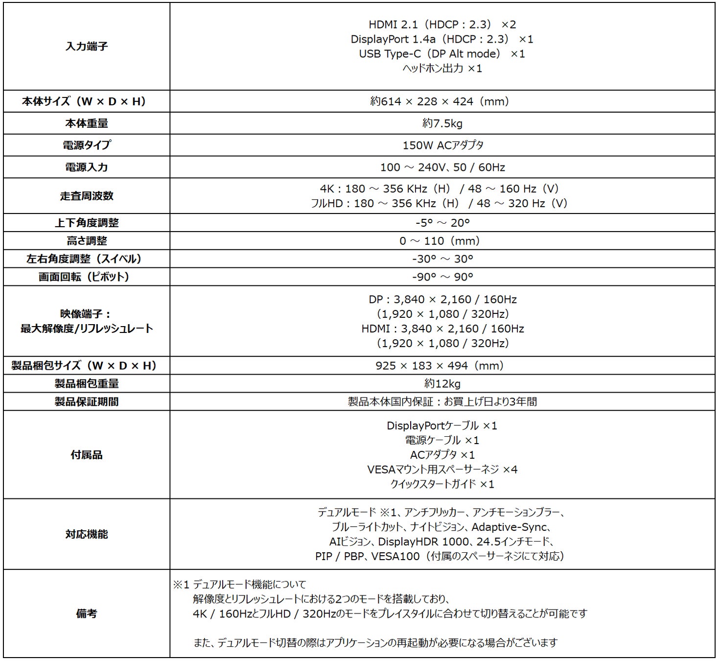 「MAG 274UPDF E16M」は、バックライトに1,152ゾーンのMini LEDを採用し、HDRコンテンツにおいて明暗の差をより細かく表現可能で、DisplayHDR 1000認証を取得し、思わず息を呑むようなリアルな映像表現が特徴なモデルです。4K / 160Hz・フルHD / 320Hzの2つのモードを素早く切り替え可能な「デュアルモード」を搭載し、高精細な映像を楽しむRPGやスピード重視のFPSなどプレイするゲームジャンルに応じて解像度・リフレッシュレートを臨機応変に切り替え可能です。高画質・高速応答に対応したRAPID IPSパネル、量子ドット技術を採用することでクリエイター向けモニターと同等な広色域表示に対応し、高いゲーミング性能と映像の美しさを両立しております。ゲーム向けの機能として、画面の表示領域を24.5インチ相当の表示領域に切り替えるディスプレイサイズエミュレート機能、黒挿入機能であるアンチモーションブラー、映像シーンに合わせて画面の明るさ・コントラスト・彩度を自動で調整するAIビジョン、Adaptive-Sync、次世代家庭用ゲームでの4K/120Hz表示に対応し、ストレスフリーでゲームプレイを楽しむことができます。また、モニターアームなどに取り付け可能なVESA規格にも対応しています。