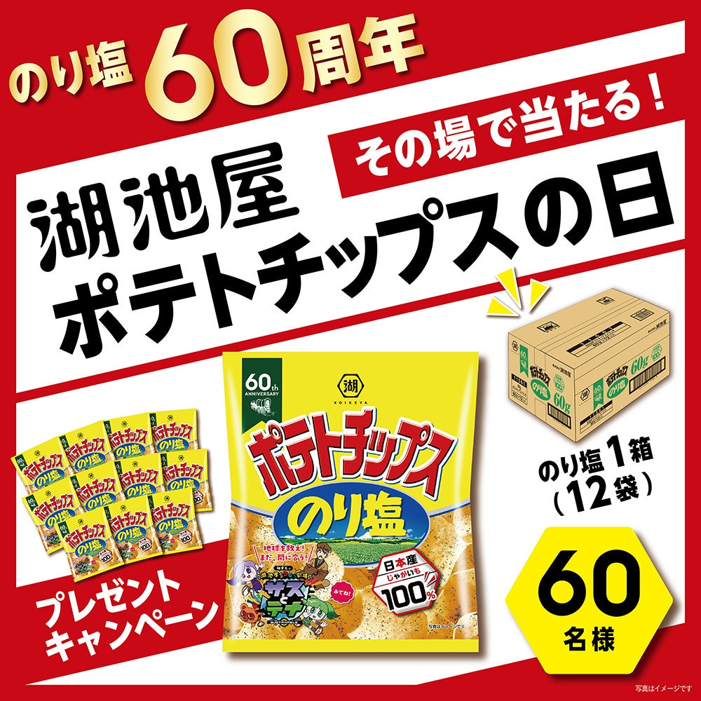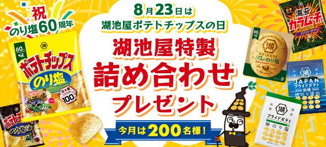 株式会社湖池屋(本社:板橋区/社長:佐藤章)は、1962年に「湖池屋ポテトチップス のり塩」を発売し、今年で丸60年を迎えました。毎年8月23日を「湖池屋ポテトチップスの日」として、日頃のご愛顧に感謝の気持ちを示すとともに、湖池屋ブランドの向上に努めてまいりましたが、今年は記念すべき60周年ということで、例年以上に“のり塩”を盛り上げるとともに、みなさまに喜んでいただきたいとの想いから、SNSを中心とした複数のプレゼントキャンペーンを実施します。