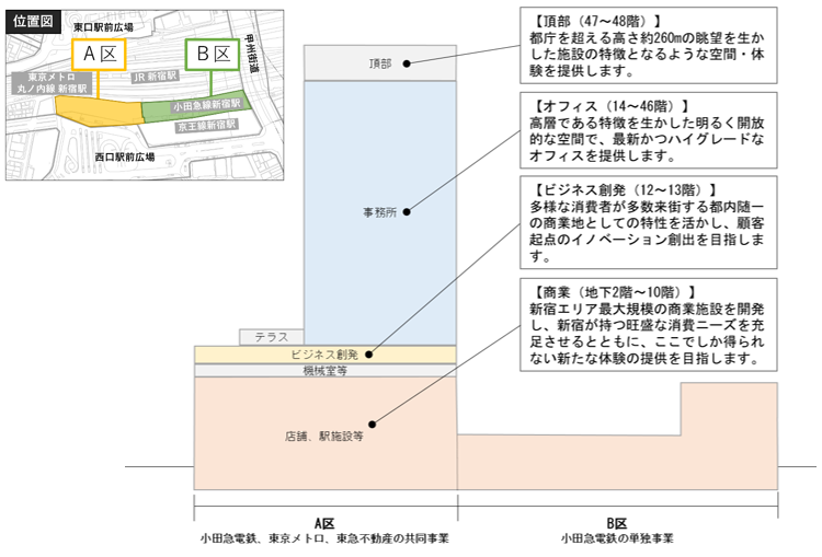 今後は、小田急電鉄、東京メトロ、東急不動産の3社が相互協力することで、世界一のターミナル「新宿駅」をはじめ、日本有数のオフィス街とエンターテインメント性豊かな繁華街という異なる顔を持ち、オフィスワーカーや国内外旅行者、来街者など、さまざまな人が行き交う多様性に富んだ新宿という街において、新たなランドマークを創出してまいります。