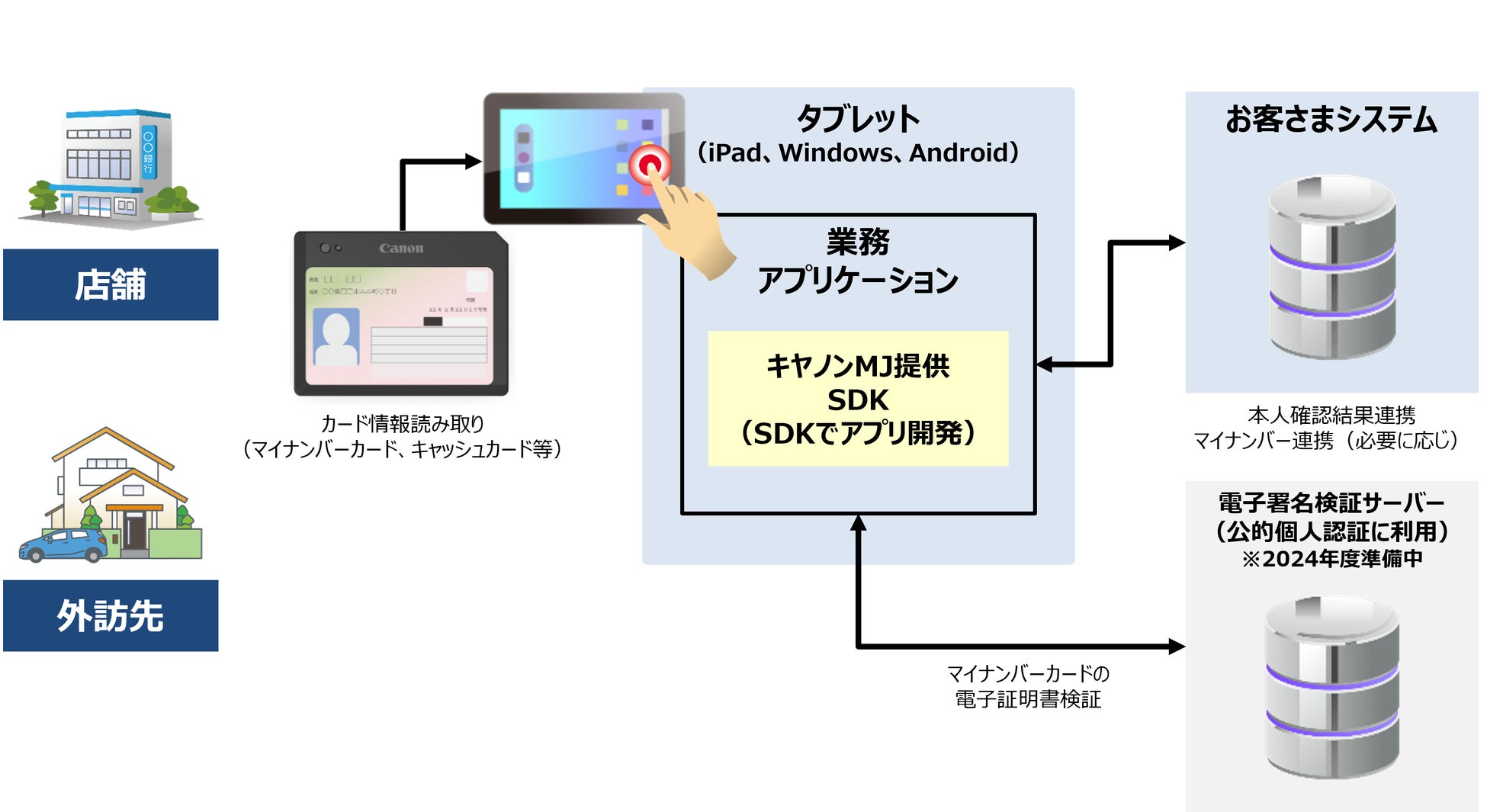 本ソリューションは、「個人認証カードリーダー ID-MY2(以下、ID-MY2)」でマイナンバーカードや運転免許証などの本人確認書類の証明書情報を読み取り、真正性を確認します。さらに、本人確認書類から読み取った情報とタブレット端末のカメラで撮影した容貌の照合や、政府が推奨する公的個人認証(JPKI)を活用することで、信頼性の高い本人確認ができます。加えて、金融機関のサービスや勘定系システムに自動連携することで、口座開設などの窓口業務やバックオフィスの事務負荷を軽減し、業務プロセス改革を支援します。