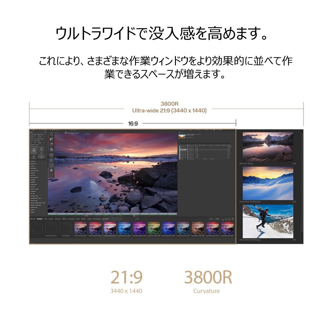 3440x1440の解像度を通じて、フルHDディスプレイの2.5倍もの詳細でクリアな画像を見ることができます。これにより、さまざまな作業ウィンドウをより効果的に並べて作業できるスペースが増えます。3800Rのパネル曲率により、曲面ディスプレイ上のすべてのポイントが目から等距離に配置されるため、作業中も快適な視覚体験が得られます。