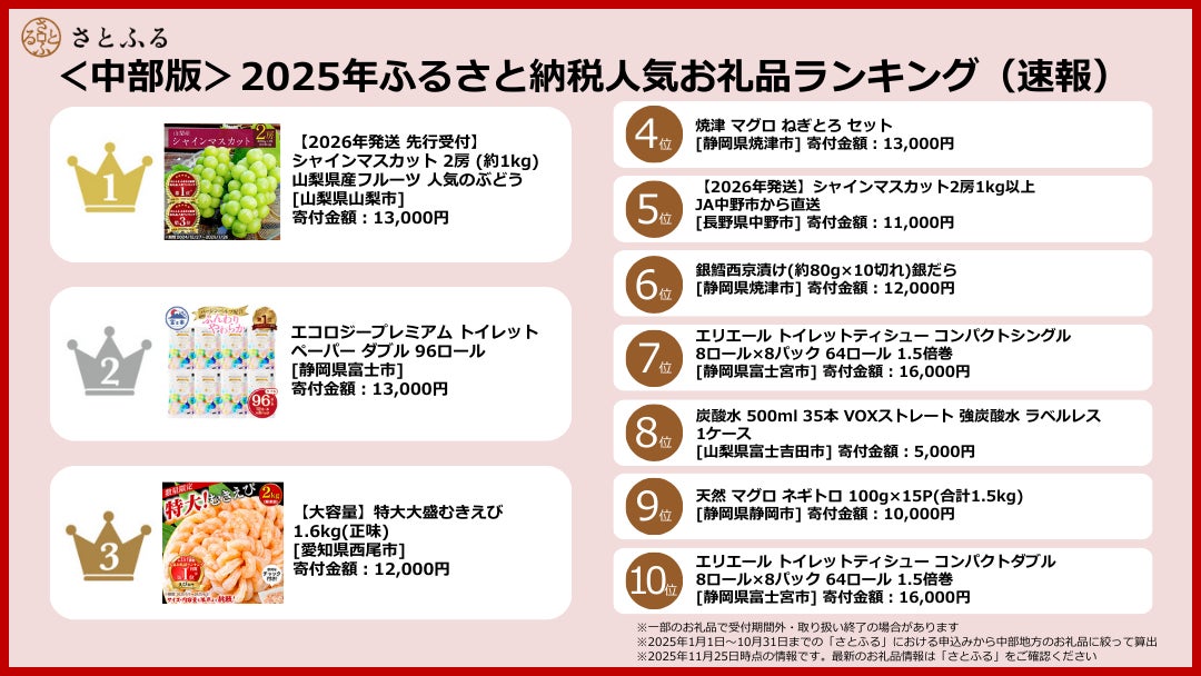 ふるさと納税ポータルサイト「さとふる」を運営する株式会社さとふる(本社:東京都中央区、代表取締役社長 兼 CEO:藤井 宏明)は、「さとふる」における<中部版>2025年人気お礼品ランキング(速報)(※1)を発表します。
