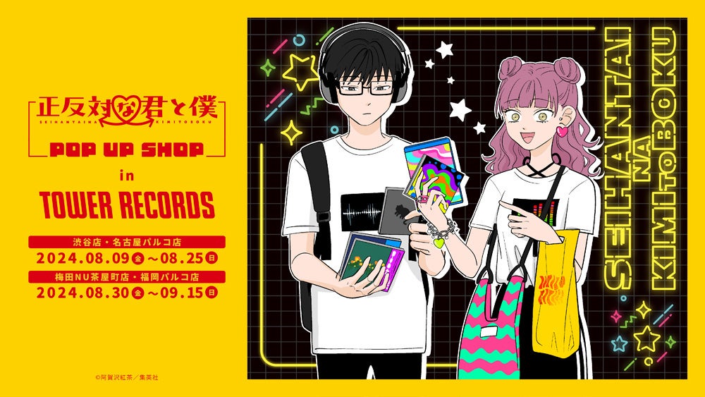 タワーレコードは、2024年8月9日(金)から9月15日(日)の間、タワーレコード渋谷店、名古屋パルコ店、福岡パルコ店、梅田NU茶屋町店の4店舗で「少年ジャンプ+」連載中の大人気コミック『正反対な君と僕』のポップアップショップを開催することが決定しました。