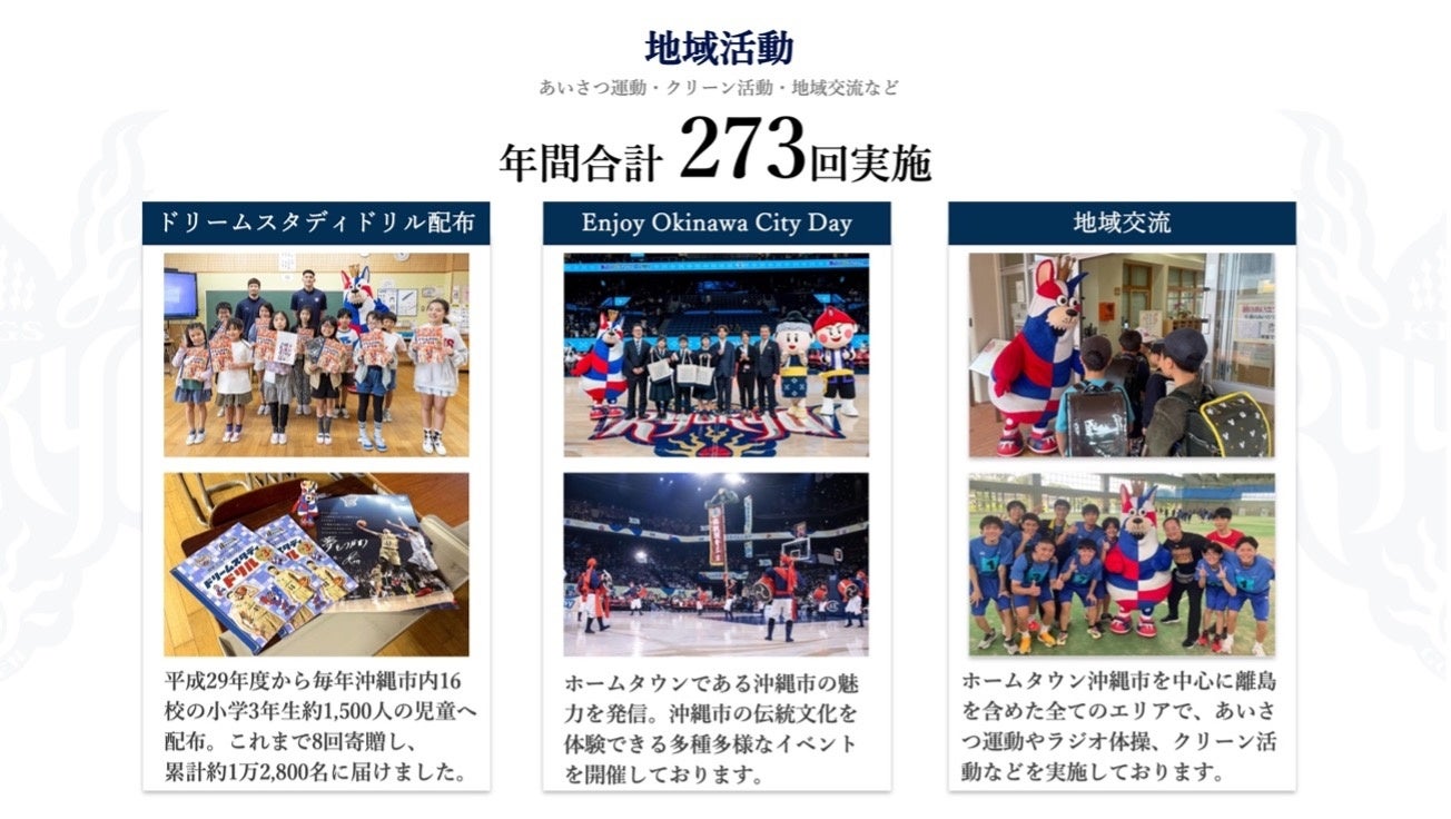 さらに、地域活動では、ドリームスタディドリルの配布、あいさつ運動やラジオ体操、クリーン活動など、ホームタウン沖縄市を中心に離島を含めた県内すべての地域で年間合計273回の交流を行い、地域の皆さま、特に沖縄の未来を担う子どもたちとも直接ふれあう機会をいただきました。