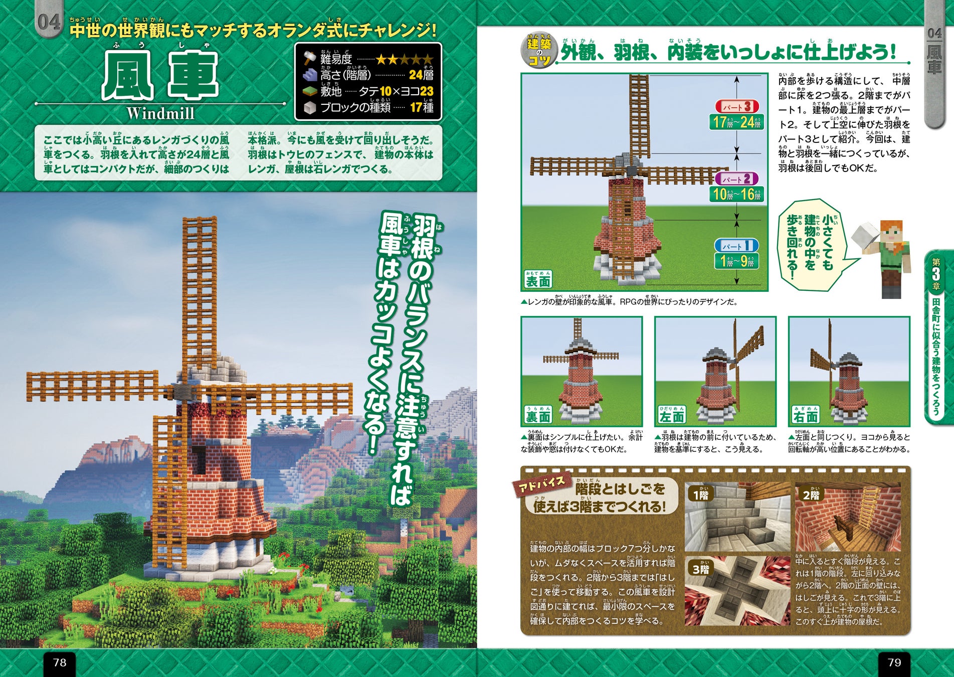 掲載している設計図は、レンガづくりの家やマンション、風車や牧場、塔、噴水、教会、寺院、城などバラエティ豊か。巻末では、これらを組み合わせた街づくりの方法なども紹介しています。