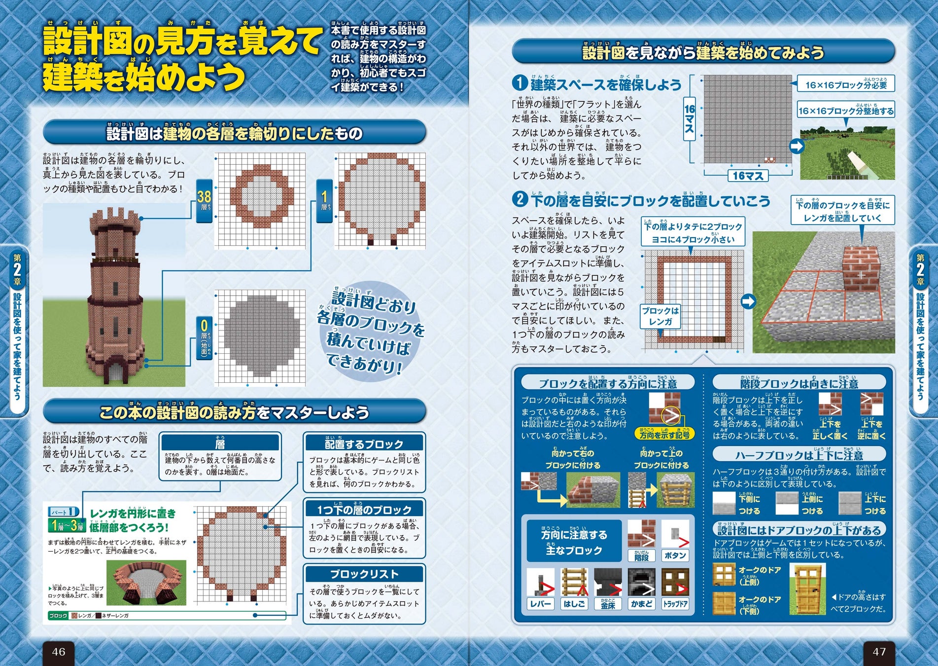 誌面では、地面の真上となる第1層、もしくは土台となる地下の第0層から順を追って最上層までの設計図を掲載。それぞれの設計図は、ひとつ前の層で置いた素材も網目で表現されており、確認しながら建築をすすめやすくなっています。