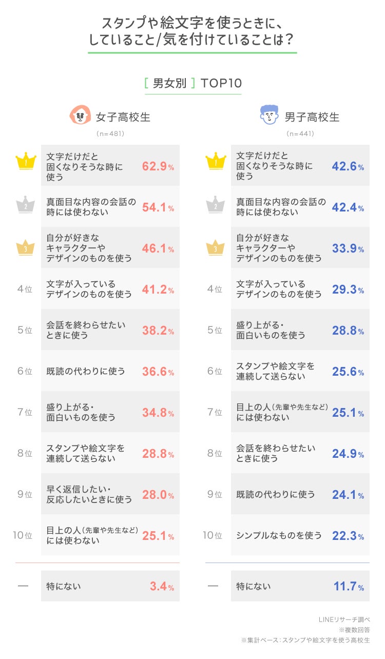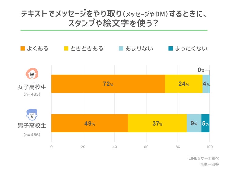 LINEリサーチ、全国の高校1年生〜高校3年生の男女を対象に、メッセージやDMなどでスタンプや絵文字をどのくらい使っているかに関する調査を実施