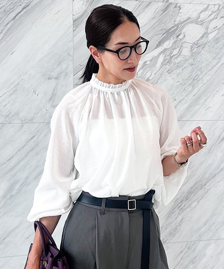 ふんわりとボリュームを出したスリーブにネックからのギャザーをたっぷり入れて、一枚でサマになるブラウスです。