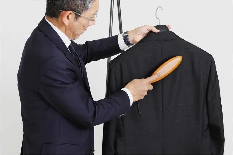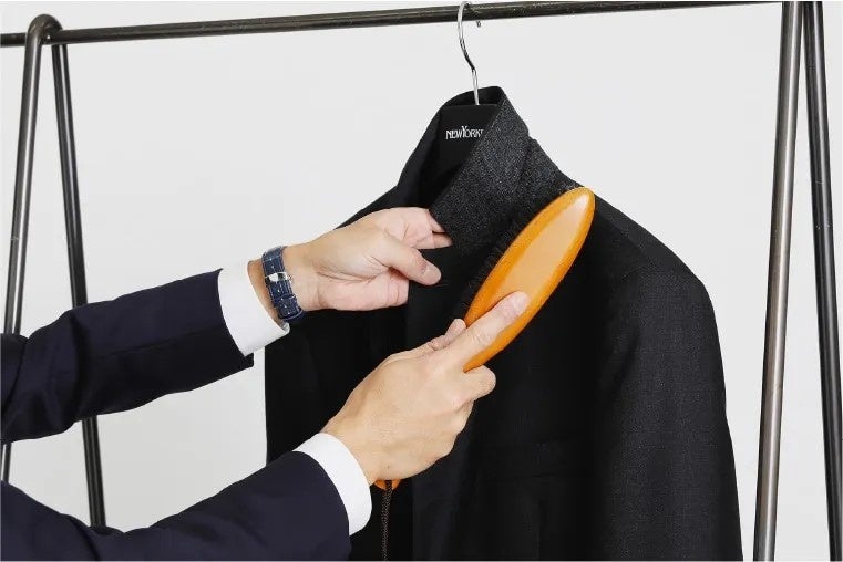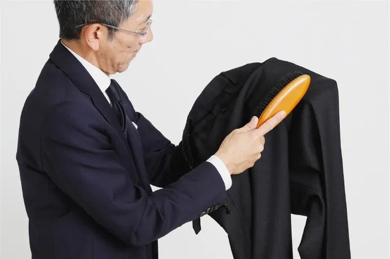 生地の目に詰まった塵やほこりを専用ブラシで取ることで、寝てしまった生地がふんわりとふくらみ、ウール独特の光沢も出ます。まず、襟→肩→裾へ向かって軽く叩きながら、ほこりを浮き上がらせます。その後、再度上から下へ、20センチ間隔くらいで手首を回転させながら細かくブラッシングします。縫い目は埃が入り込みやすいので特に丁寧にかけましょう。