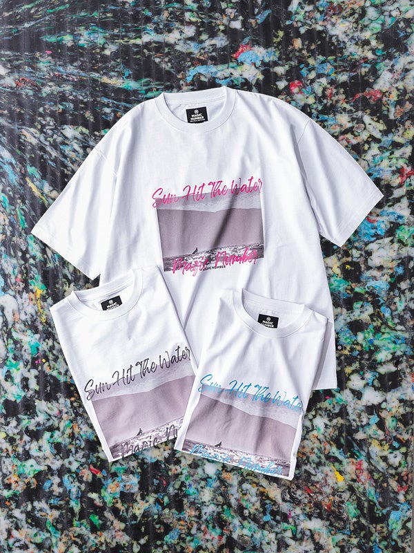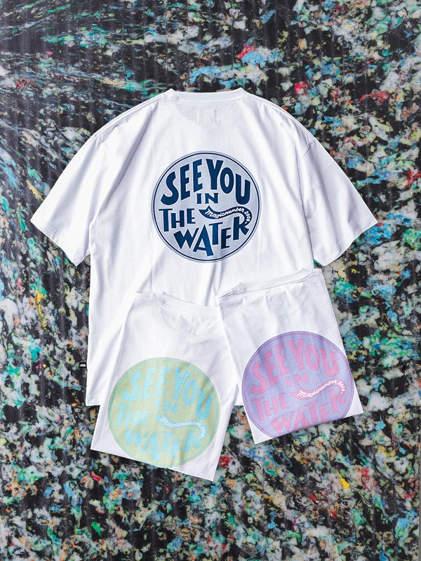 海岸等で回収したペットボトルをリサイクルして素材をつくり、商品化する取り組み“UpDRIFT(アップドリフト)”と、ビーチ、サーフカルチャーとの親和性が高いMAGIC NUMBERを迎えたコラボレーションTシャツ。MAGIC NUMBERのアイコンである“SEE YOU IN THE WATER”というワードをプリントしました。