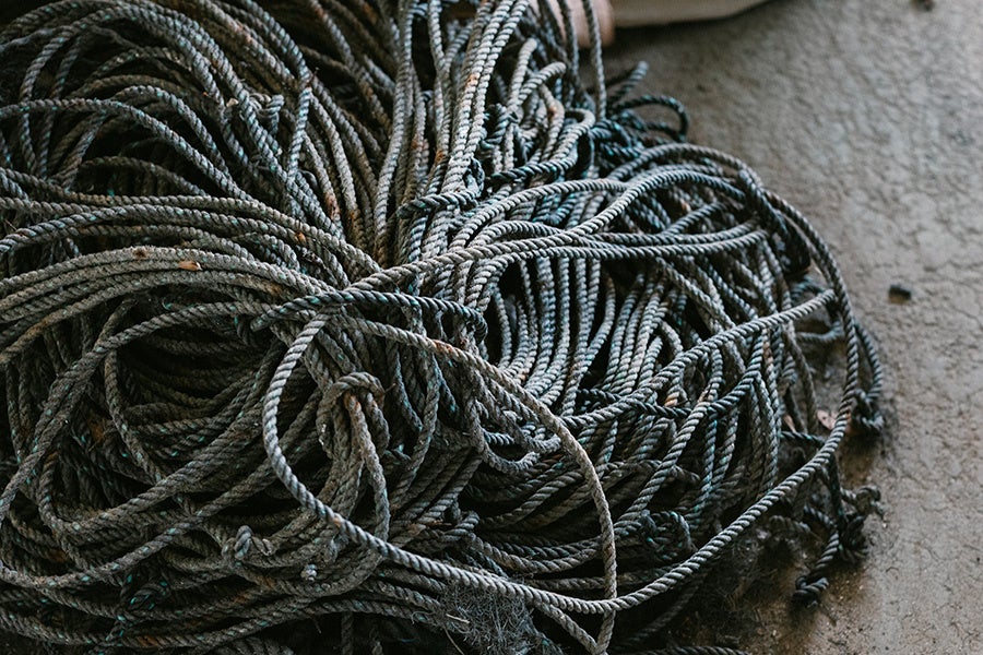 amu株式会社は全国の漁港を巡り、“産業廃棄物”である廃漁具を“原料”として買い取る活動を行っています。それらを分別・加工し、再び素材として蘇らせたものがamuca®です。