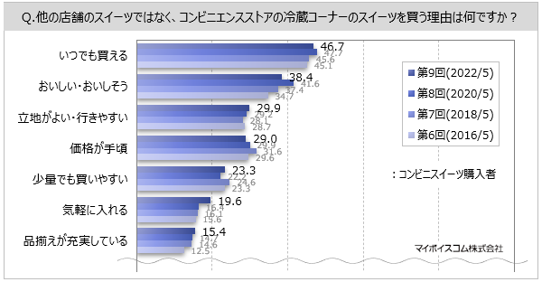 マイボイスコム株式会社(東京都千代田区、代表取締役社長:高井和久)は、9回目となる『コンビニスイーツ』に関するインターネット調査を2022年5月1日~5日に実施し、10,170件の回答を集めました。調査結果をお知らせします。