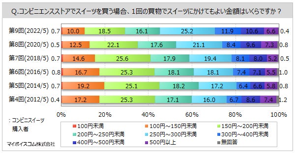 【コンビニスイーツに関する調査】コンビニスイーツの購入者は6割弱。1回あたりの購入金額は「250円~300円未満」がボリュームゾーン、2014年以降価格帯が上昇傾向