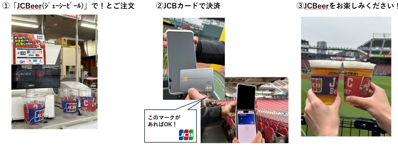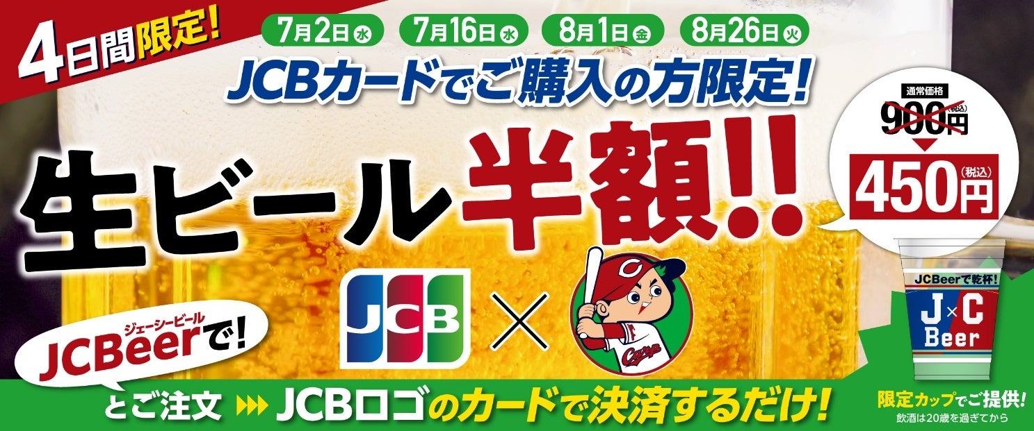 また、マツダ スタジアムでは2025年6月6日より売り子でのキャッシュレス対応が始まり、グッズショップ、入場券売場、飲食店舗(ワゴン売店・むさしを除く)、売り子の全てでキャッシュレス決済サービスのご利用が可能となります。それに伴い、広島東洋カープは、便利になったスタジアムで楽しく観戦してもらうため4日間限定でJCBeer(ビール半額)イベントを実施します。