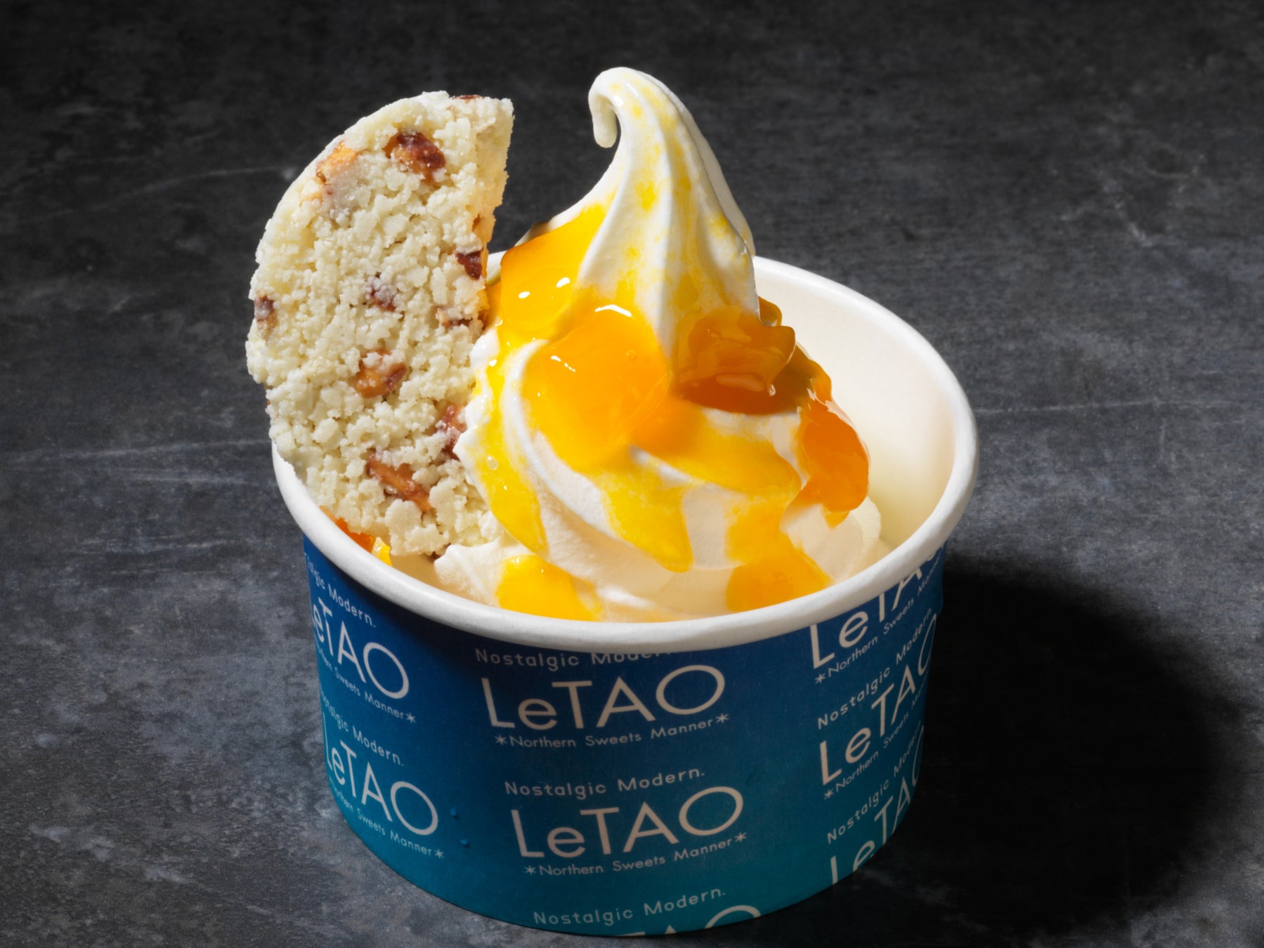 サクサクのフィアンティーヌに、ミルキーでコクのあるジャージーミルクソフトを絞り、華やかな香りが広がるルタオオリジナルの赤肉メロンソースをトッピング。北海道産の赤肉メロンを使用したソースの芳醇な香りと、濃厚なミルクの甘みが絶妙にマッチし、深みのある味わいに仕立てました。ミルクソフトに付け合せるのは、新千歳空港店限定「まああるブランシェール」。夜限定のテイクアウトスイーツです。