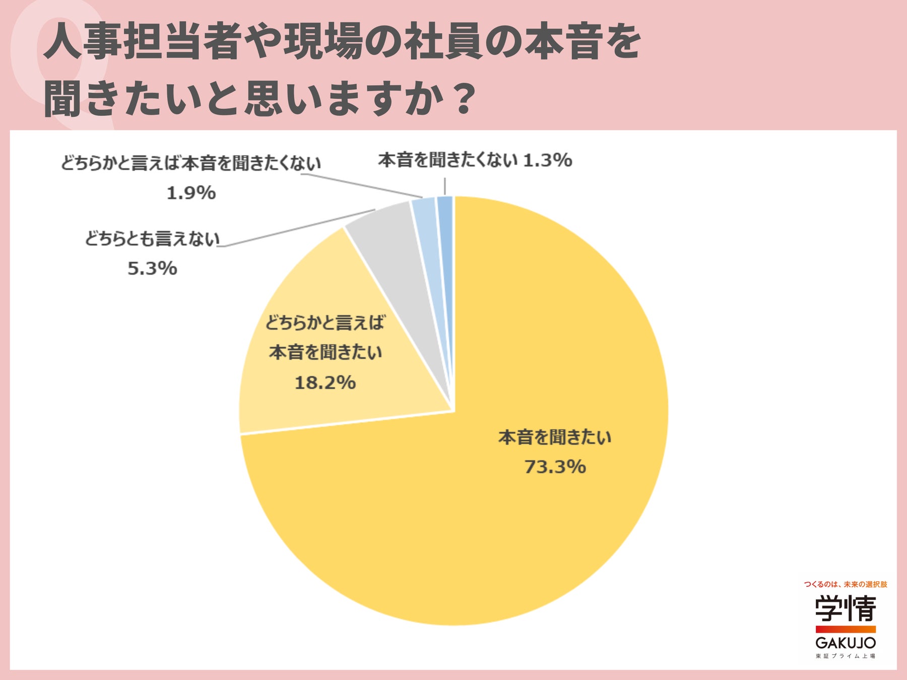 人事担当者や現場の社員の「本音を聞きたい」と回答した学生が73.3%に上りました。「どちらかと言えば本音を聞きたい」18.2%を合わせると、9割以上の学生が「本音を聞きたい」としています。「Webに掲載されている情報や説明会で話している内容は、PR要素が強いと思う」「人事担当者の個人的な思いや考えも聞きたい」「良い面だけでなく課題も教えてくれると、より企業のために頑張りたいと思える」「面接のフィードバックなどで、ハッキリと改善点を伝えてくれる大人は尊敬できる」といった声が上がりました。