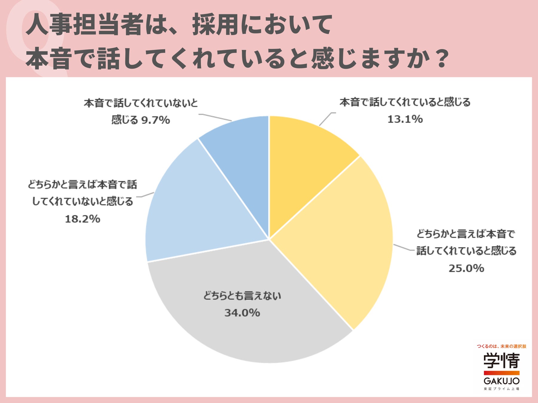 株式会社学情(本社:東京都中央区)は、2025年3月卒業(修了)予定の大学生・大学院生を対象に、インターネットアンケートを実施。今回は、「人事担当者とのコミュニケーション」について調査しました。採用において、人事担当者が「本音で話してくれていると感じる」と回答した学生は、約4割となりました。一方、「本音で話してくれていないと感じる」と回答した学生も3割に上りました。「会社の顔として採用担当をしているので、良い面にフォーカスして話すのは仕方ないと思う」「ある程度、建前でのコミュニケーションになるのは当たり前のことだと思う」「本音で話そうと思ってもらえるように、自身の本音を伝えるようにしている」といった声が上がっています。また、9割以上の学生が、人事担当者や現場の社員の「本音を聞きたい」と回答しました。