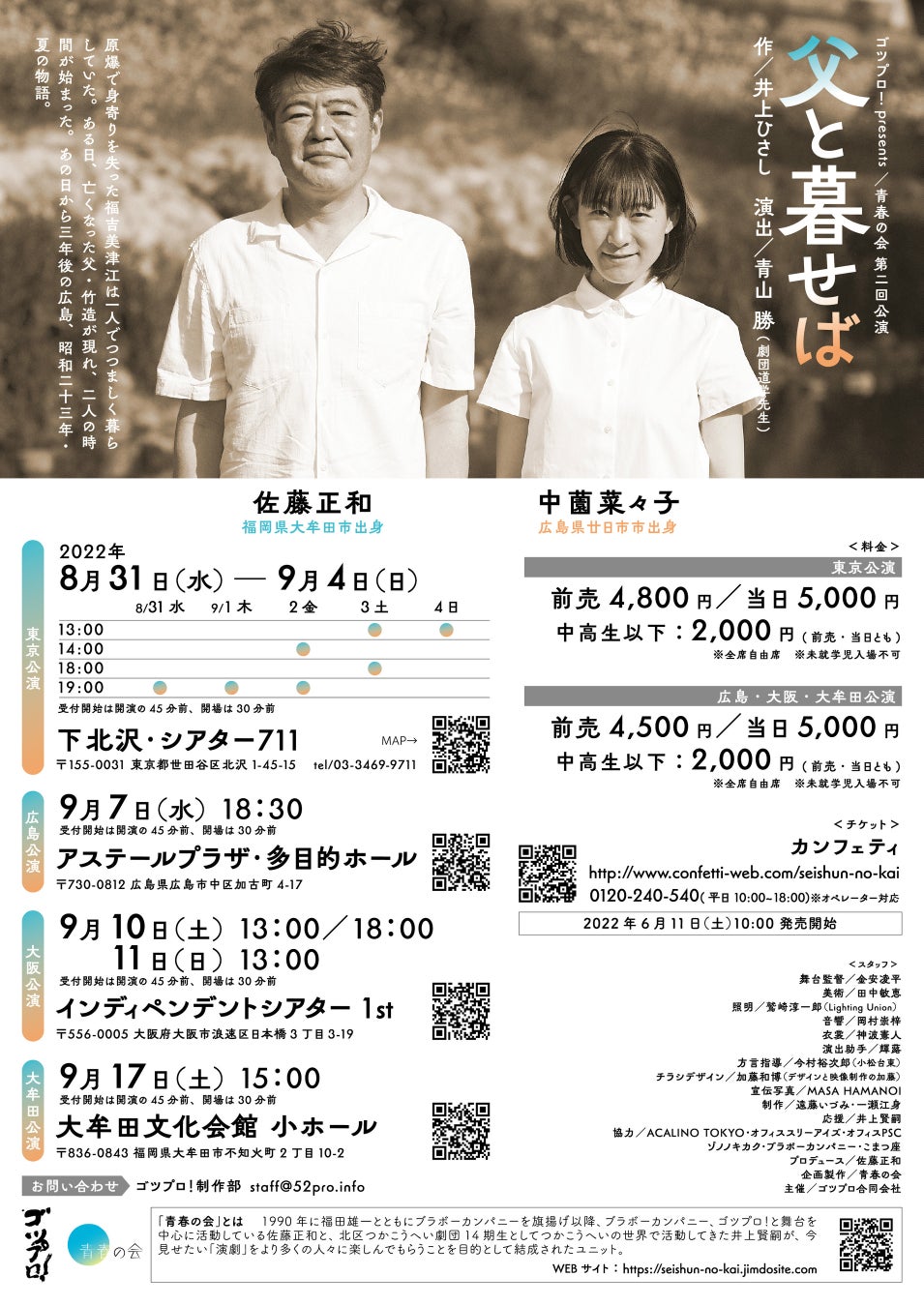 ゴツプロ合同会社主催、青春の会 第二回公演『父と暮せば』が東京・広島・大阪・福岡4都市にて上演されます。