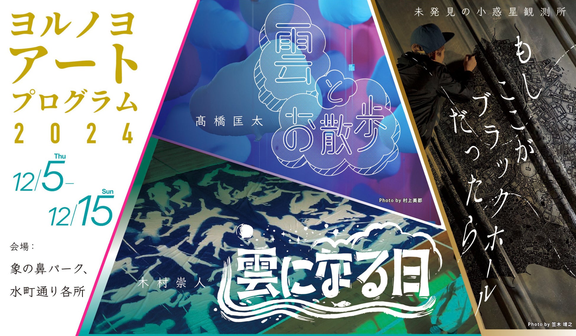 アーツコミッション・ヨコハマ(公益財団法人横浜市芸術文化振興財団)では「もしここがブラックホールだったら」「雲とお散歩」「雲になる日」を開催します。夜だからこそ楽しめる光とアートプログラムの「ヨルノヨ・アートプログラム」として、冬の横浜を彩ります。2024年12月5日(木)から12月15日(日)までの間、横浜の港のはじまりとも言える「象の鼻パーク」や横浜を代表する観光スポットに囲まれる「水町通り」など、まちを巡りながらアートをお楽しみください。