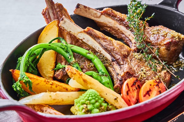 (左)骨付き羊肉のソテーと春の野菜 サルモリーリオソース