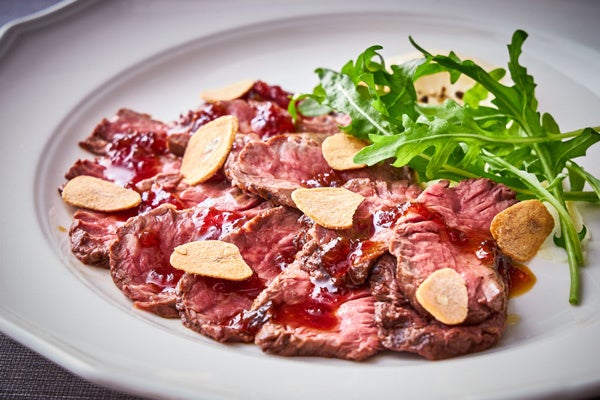 (右)牛ハラミステーキ ガーリックオニオンソース セルバチコ添え