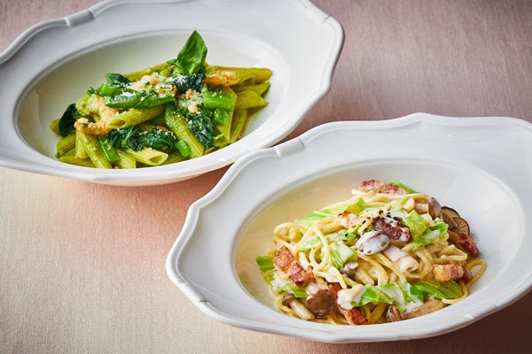 15種類の野菜を使用した前菜は、旬のものやヘルシー食材を用いてワンプレートにしました。鮮やかな緑色が目を引く一品は、旬のグリーンピースを使用した香りと甘みが格別なスープです。ヘルシー食材を使った料理では、豆を使った“チリコンカン”や、整腸効果がある梅肉を使った“鶏ささみと梅肉“、”豆乳ババロア“をご用意します。野菜サラダにかける“発酵ドレッシング”はオーヴェストのオリジナル。野菜の自然な甘さを引き立てる優しい味わいで、ヨーグルトを使用した腸活効果もあるドレッシングです。メインのパスタは2種類あり、それぞれ旬の野菜をお楽しみいただけます。みずみずしく柔らかな歯ごたえが特徴の春キャベツのクリームパスタ、柔らかさが増し甘みものった小松菜のペンネ ジェノベーゼソースよりお選びいただけます。プラス料金でメインを魚料理または肉料理に変更することもでき、魚料理はまさに今が旬の桜鯛をご提供いたします。クセがなくあっさりとした上品な甘みが特徴の桜鯛を焼き上げ、バルサミコソースにあわせたおすすめの一品です。食事の締めくくりには、酸味と甘みのバランスが絶妙な、デコポンや金柑のアイスなど春の柑橘類を堪能いただける季節のパフェをご賞味ください。