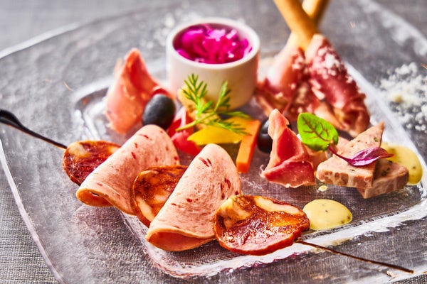 (左)スペイン産生ハムとイベリコチョリソー モルタデラとパテ・ド・カンパーニュの盛り合わせ