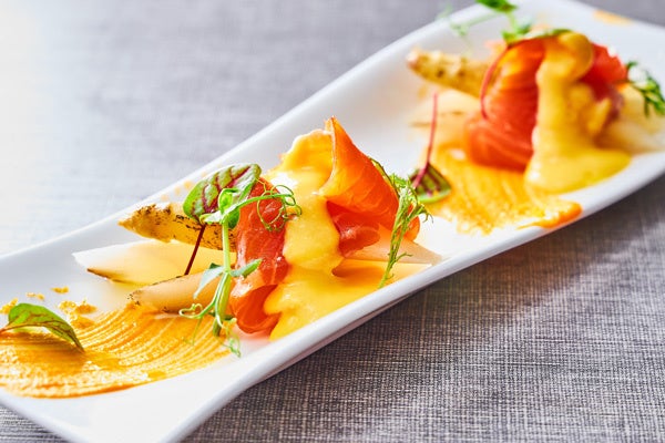 (右)サーモンのマリネとホワイトアスパラガス“マルテーズソース”