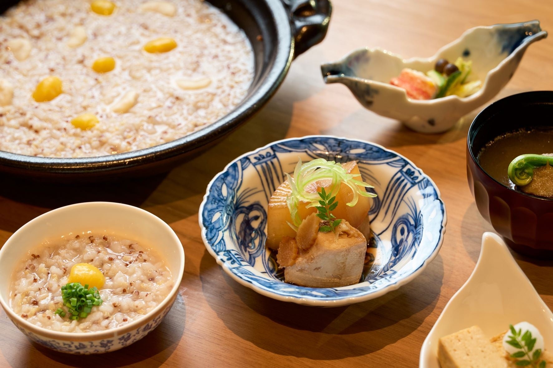 3日目の朝食には、客室にて健康的な雑穀粥と小鉢を提供します。地元で栽培された栗に似た食感の鳳眼果(ピンポー)の実やキヌアなど、うま味成分であるグルタミン酸を豊富に含む食材を使用した雑穀粥は、滋味深い味わいです。客室で提供する朝食は、体を芯から温め、一日の活力を与えます。
