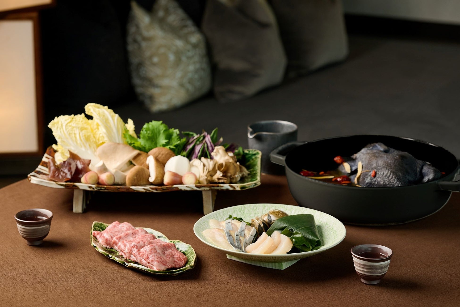 2日目の夕食は、「温補チョウザメ鍋」です。体の内側から温まるよう、滋養豊富な烏骨鶏(うーぐーじー)と鰹出汁を合わせたスープに、帆立や蛤などの海の幸、また谷關の名産であり栄養価の高いチョウザメを使用します。夜に温かい鍋を食べることで心身が温まり、リラックスできます。