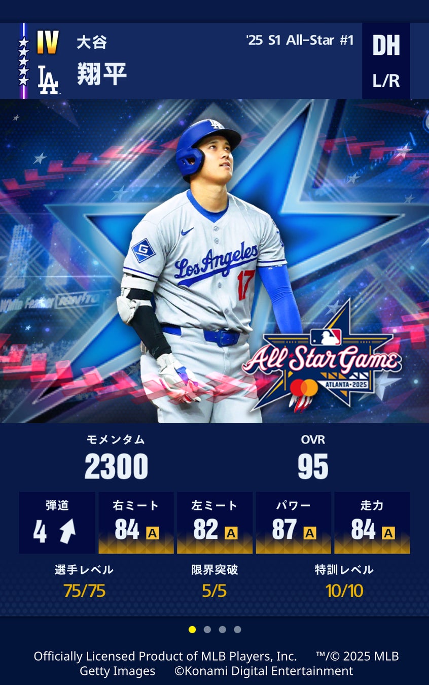 今回登場した新バージョンの大谷選手は、これまでに『メジャスピ』で登場した大谷選手のOVR(総合的な能力の高さを表す数値)を更新し、過去最高の「95」に!パワー「87」と走力「84」も、『メジャスピ』に登場する大谷選手として過去最高の数値となっています。