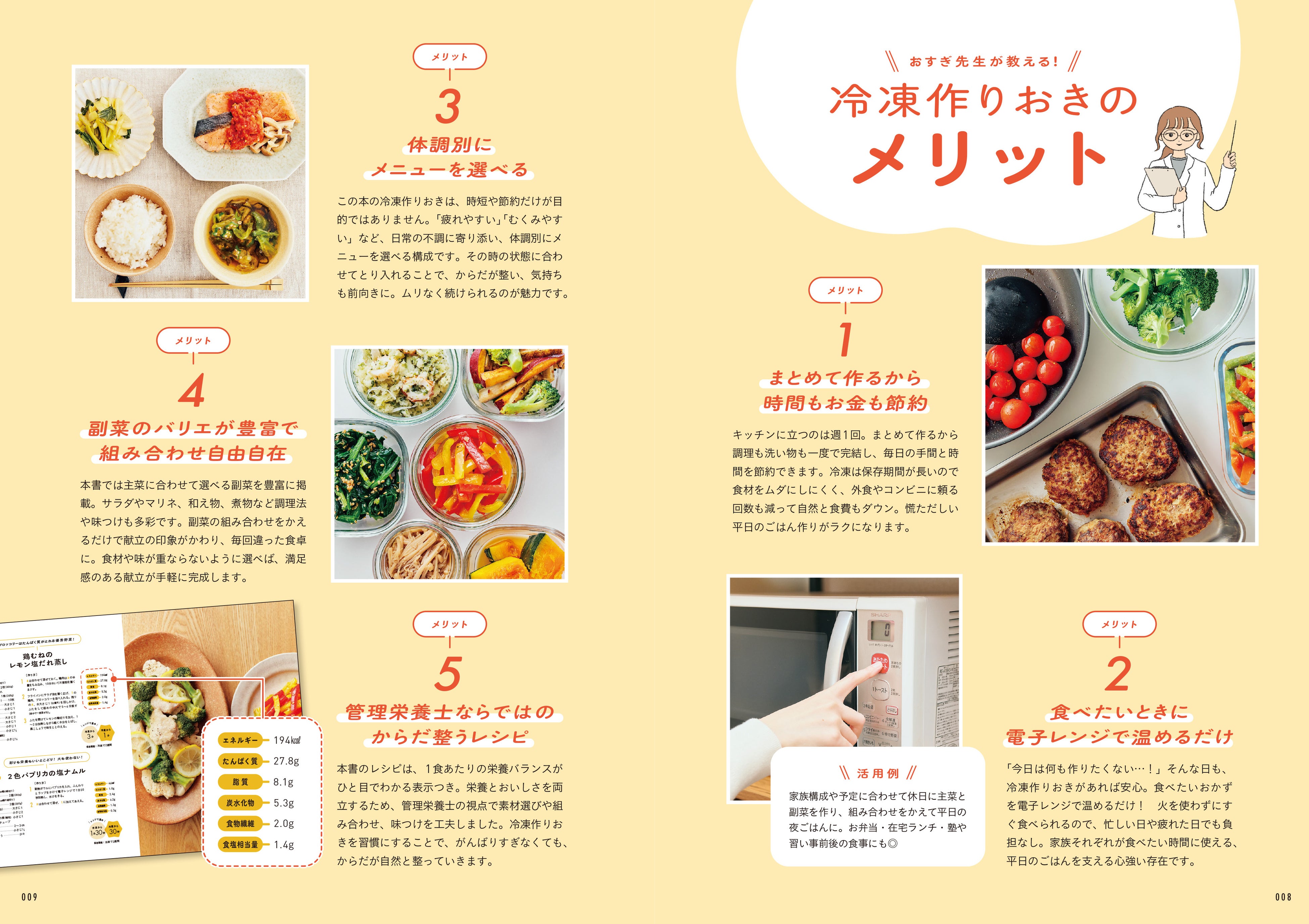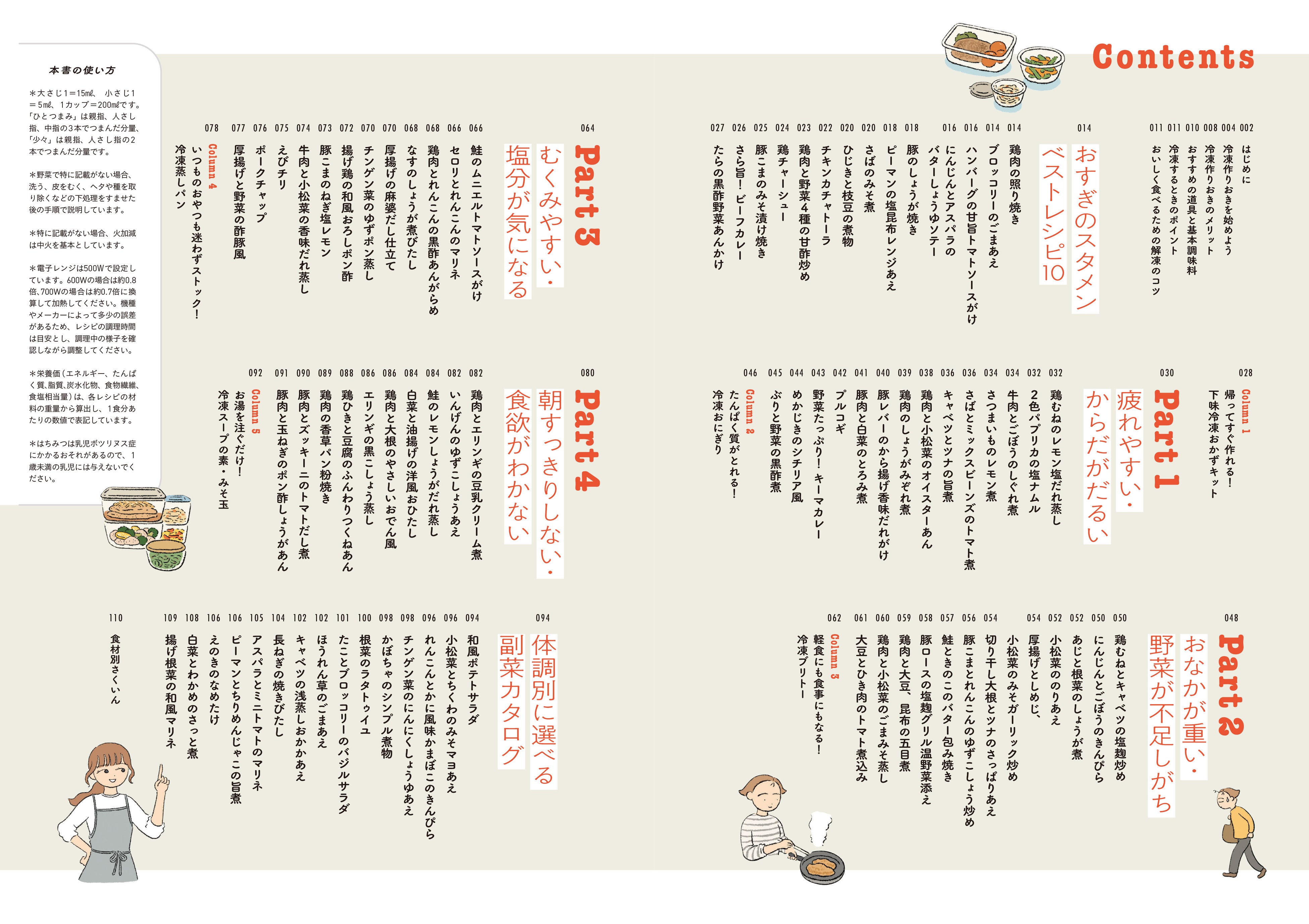 ごはんと一緒に保存容器につめて冷凍すれば「冷凍弁当」にもなるほか、習い事前の間食や夜食など、家族それぞれの暮らしに合わせて自由に活用することができます。栄養バランスとおいしさにこだわった全94レシピを掲載。ご要望が多かった、冷蔵庫にある食材からレシピを探せる便利な索引ページも!