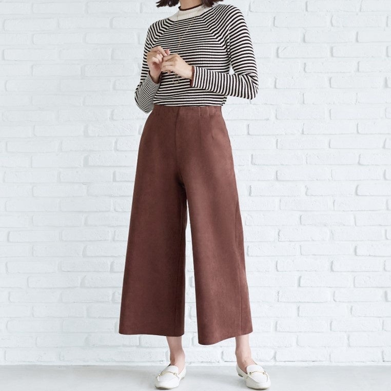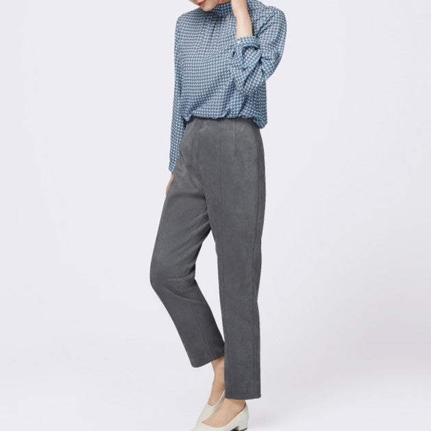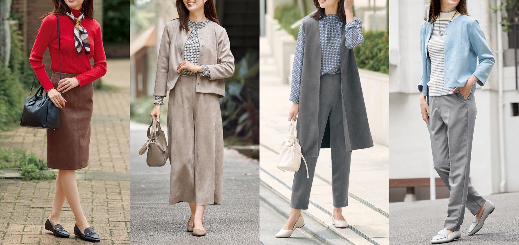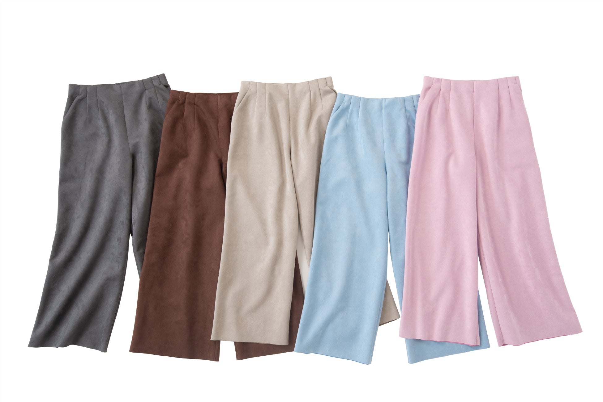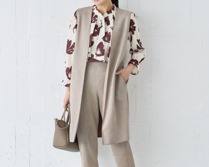 N+のスウェード調素材は、上品な光沢とあたたかみのある素材感で、一枚で秋らしいコーディネートが完成します。やわらかな肌ざわりでストレッチも効いているため、着心地の良さも特長です。