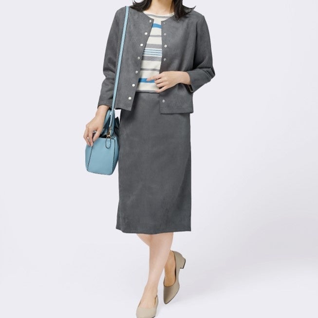 スウェード調素材のアウターは、柔らかく伸縮性があるため、すっきりとしたシルエットながらも快適な着心地。さらっと羽織るだけで、コーディネートに品のある雰囲気をプラスします。