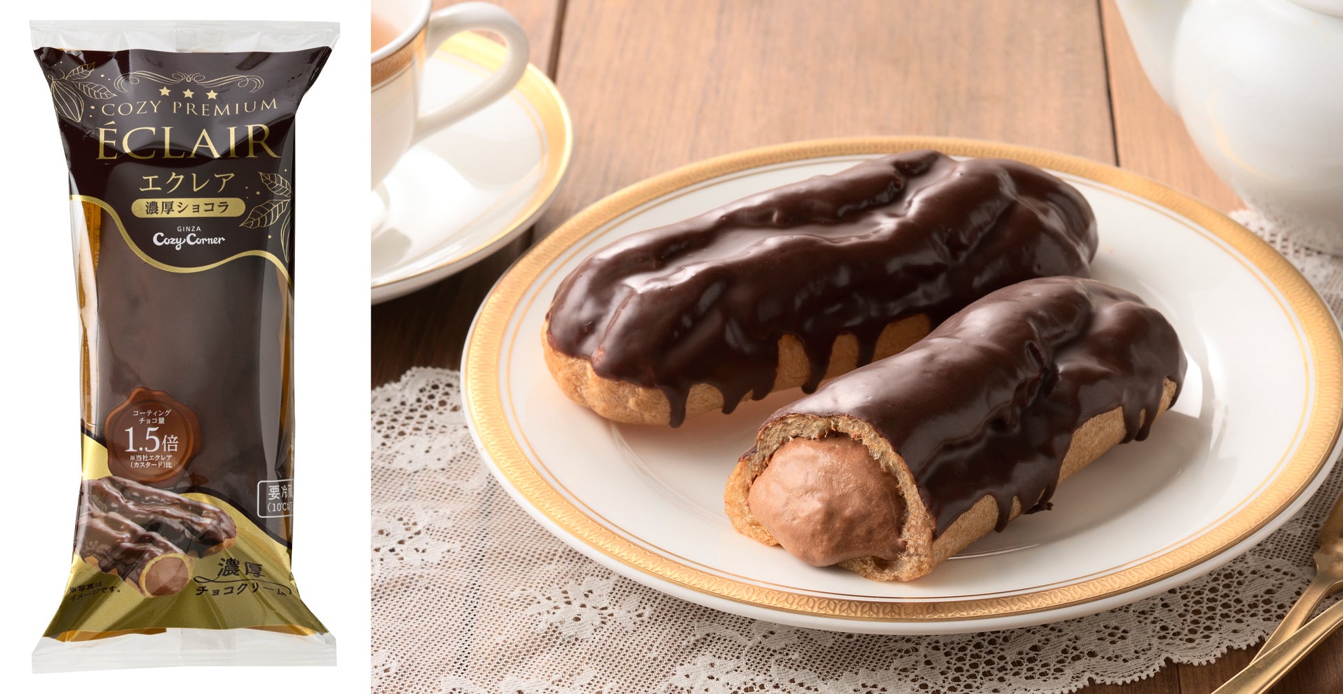 「コージープレミアムエクレア(濃厚ショコラ)」は、3種類のチョコレートをブレンドしたチョコレートクリームを詰め、通常のエクレア(カスタード)の1.5倍のチョコでコーティング。チョコを存分に堪能できる、まさに濃厚な一品です。