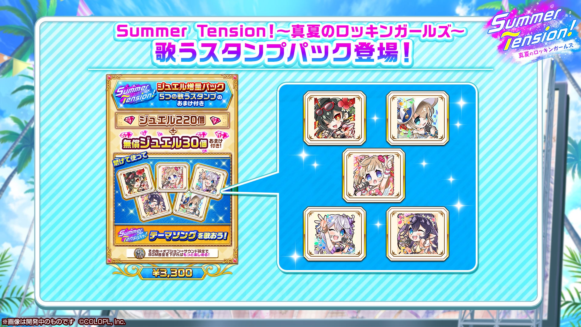 今回のジュエルパックには、「プレミアムジュエルパック」や「プレミアムジュエルパック Lite」加えて、協力バトルで使用できる「歌うスタンプ」が付いた『Summer Tension!〜真夏のロッキンガールズ〜歌うスタンプパック』が販売ラインナップされております。