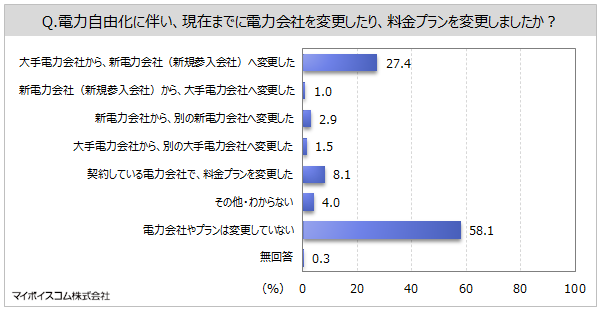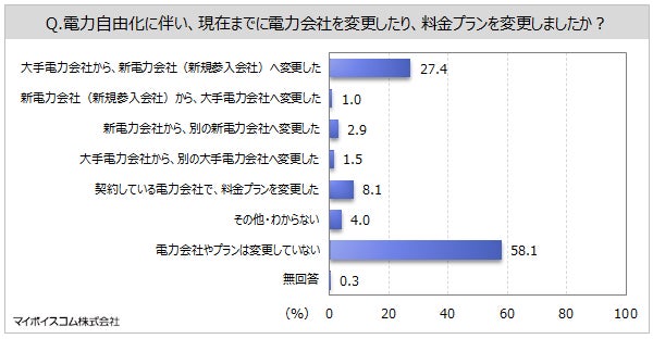 【電力・ガス自由化に関する調査】新電力会社と契約している人は3割弱で増加傾向。電力自由化後に電力会社を変更した人は3割弱、料金プランを変更した人は約8%