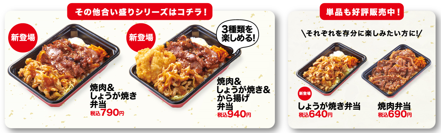 「焼肉&から揚げ弁当」740円(税込)、「しょうが焼き&から揚げ弁当」740円(税込)