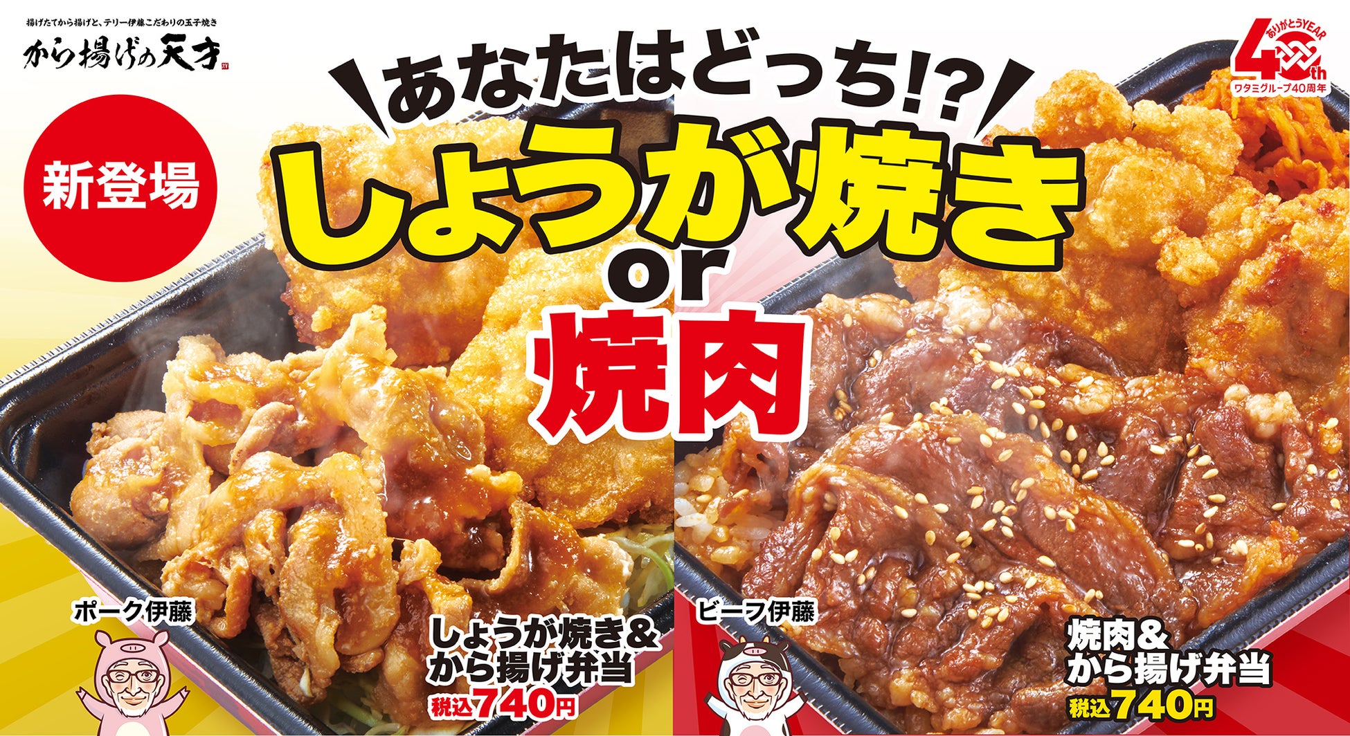 【から揚げの天才】あなたは「しょうが焼き」派?「焼肉」派? お好みの組み合わせが選べる合盛り弁当が新登場!