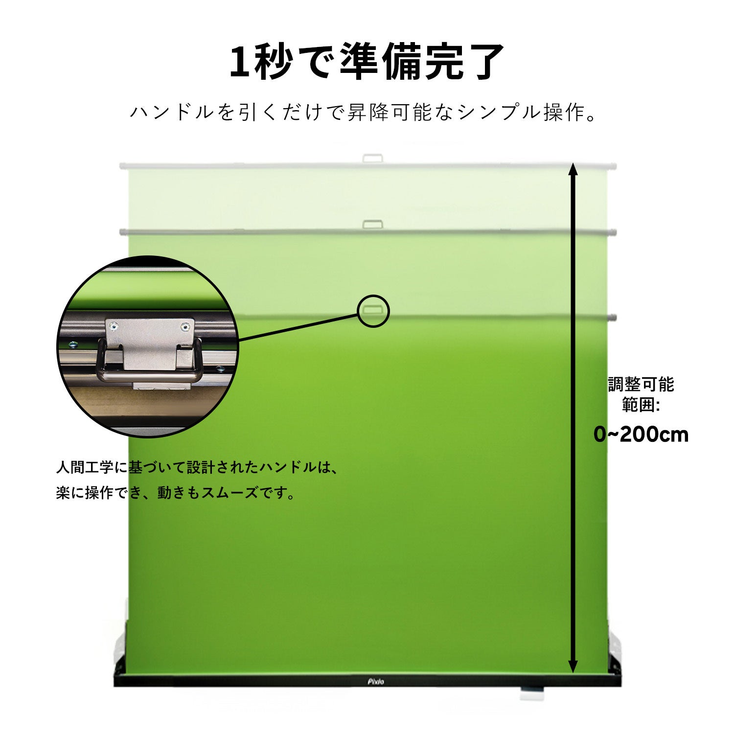 ハンドルを引くだけのシンプルな操作で約200cmまで柔軟に高さ調整可能です。ストッパーなどなしでどんな位置でもピタッと止めることができるので、あらゆるシーンに柔軟に対応できます。また垂直昇降型フレームにより、揺れにくく安定感は抜群です。