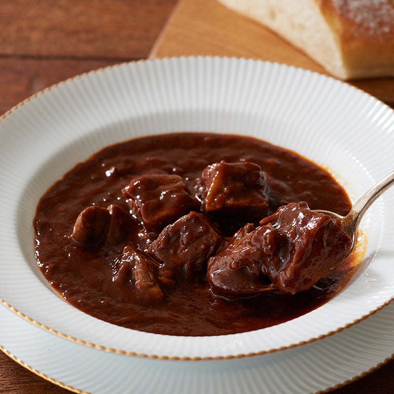 十勝豊西牛の肩ロース肉を、こだわりのデミグラスソースでじっくりやわらかく煮込んで。風味と食感の良い北海道産マッシュルームを加え、コク深く仕上げました。