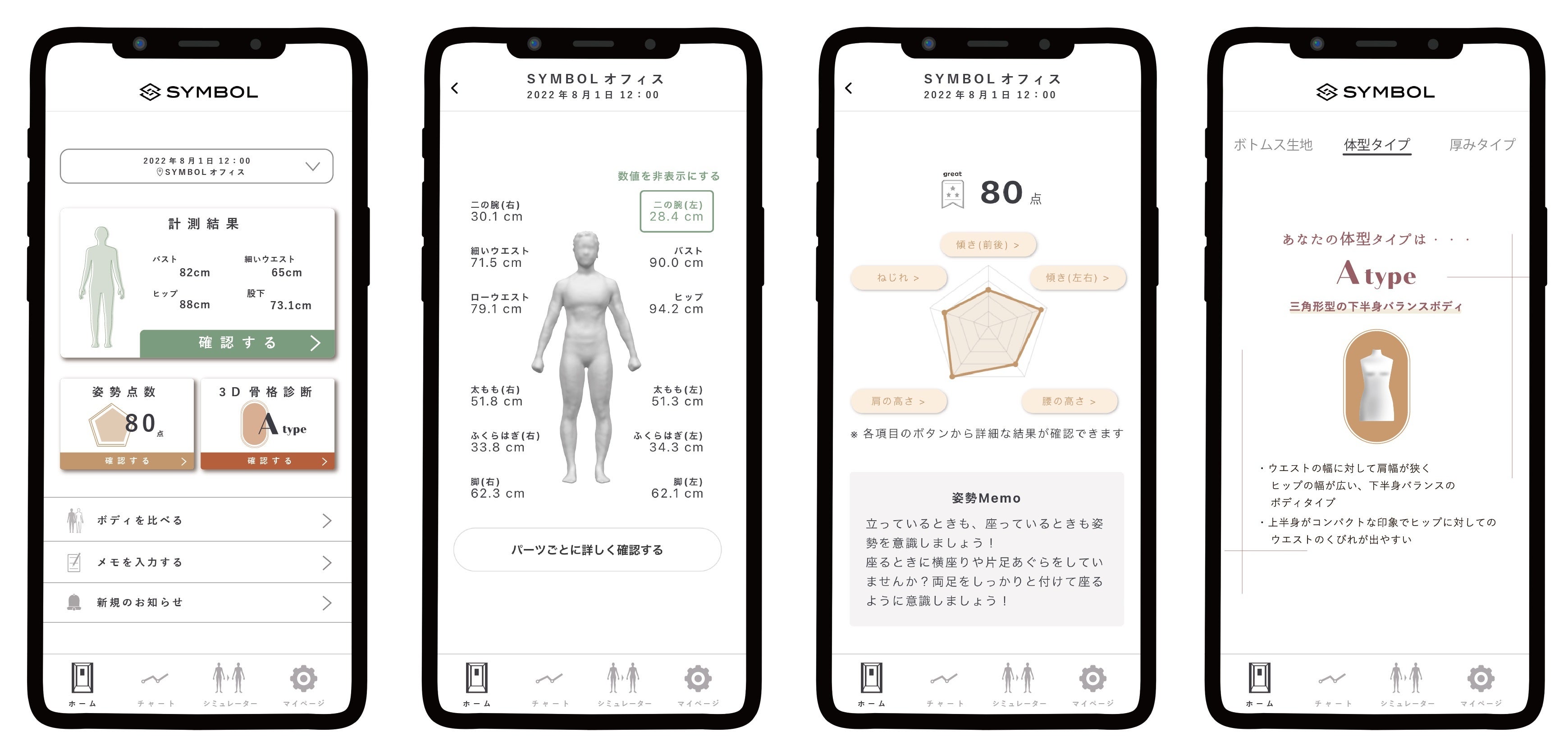 わずか0.8秒で詳細な身体のサイズ情報や姿勢診断が分かるSYMBOL社の3Dボディスキャナーで、3D骨格診断サービスがスタート。肩、ウエスト、ヒップの幅を、正面から測定し4通りに、サイドからの測定で9通りに解析されます。正面から見たシルエットは、「I」「X」「V」「A」、アルファベットで表現され、例えば「I」は肩からウエスト、ウエストからヒップにかけての傾斜が緩やかなタイプで、直線的なシルエットが似合うといったものです。