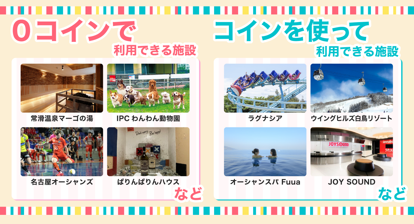 【愛知県】ラグナシア、豊橋総合動植物公園(のんほいパーク)、IPCわんわん動物園、安城産業文化公園 デンパーク、愛知牧場、邦和みなと スケートリンク、観覧車Sky-Boat、和のリゾートはづ、旬景浪漫 銀波荘、CRED SPA SAUNA、SAUNA ROUTINE、常滑温泉マーゴの湯、スパ&フィットネス 大泉寺温泉 福の湯、篠木温泉 満天望、清洲城、名古屋ダイヤモンドドルフィンズ、名古屋オーシャンズ、イチロー展示ルーム「I-fain」、exstretch日進東郷店、ディノアドベンチャー名古屋、JOYSOUND 名駅太閤口店、JOYSOUND 名駅二丁目店、JOYSOUND 名駅三丁目店、JOYSOUND 名駅三丁目中央店、JOYSOUND 金山店、JOYSOUND 萩野通店、ぱりんぱりんハウス、コムテックタワー